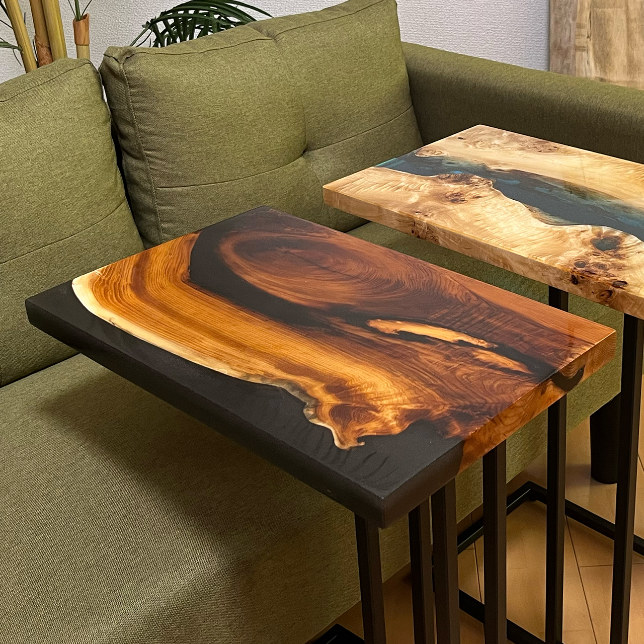 様々な種類の天然木でレジンリバーテーブルを製作しています。サイドテーブルを中心に様々なサイズを製作していきます。プライベート空間やお店のアクセント、宿泊施設のラウンジを彩り、さらなる癒しの空間を提供します。